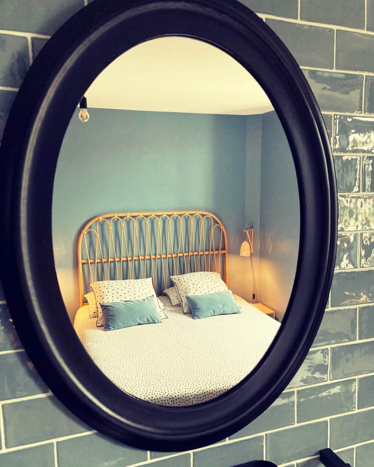 Clin d’oeil à l’artiste Louise Bourgeois, cette chambre cocon bleue et sa salle de bain assortie plaira au plus grand nombre avec notamment sa jolie vue sur la Rance et la petite écluse de Léhon.